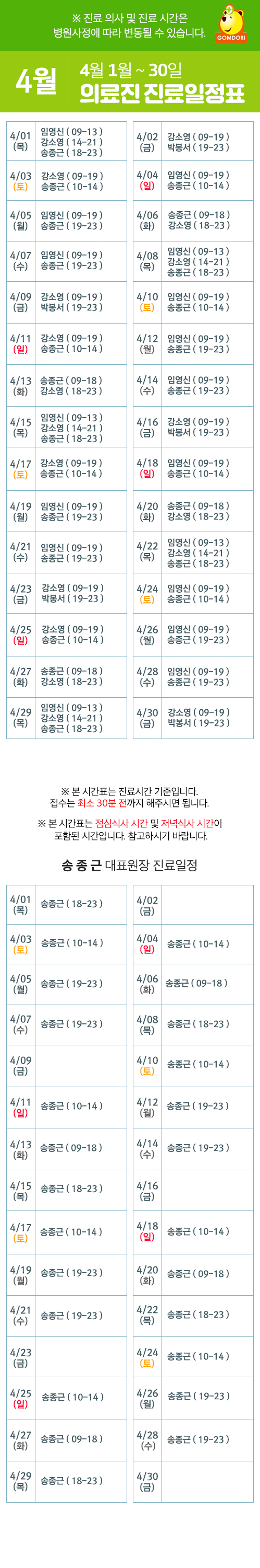 3월 의료진 및 송종근 대표원장 진료일정표
