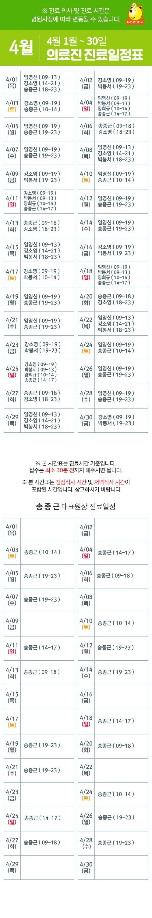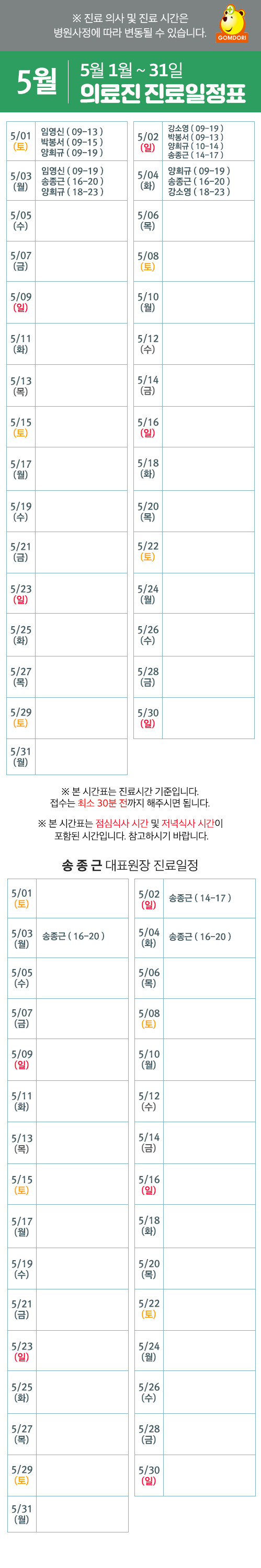 ※ 진료 의사 및 진료 시간은 병원사정에 따라 변동될 수 있습니다.