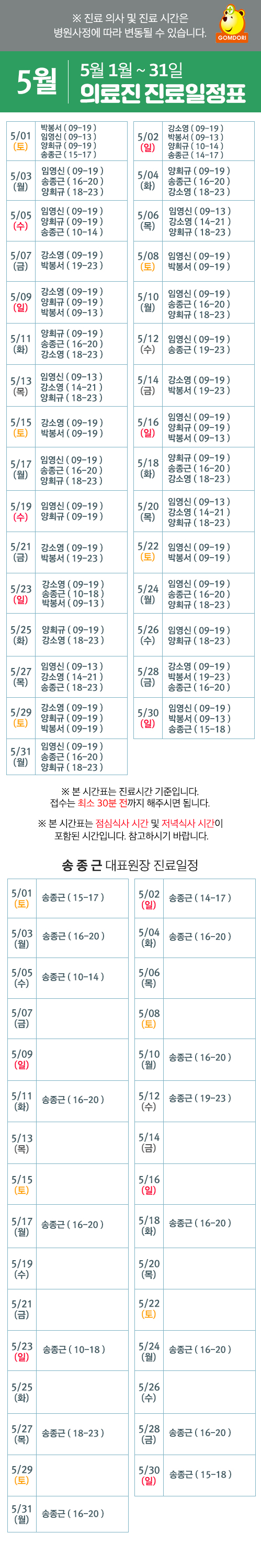 5월 의료진 및 송종근 대표원장 진료일정표