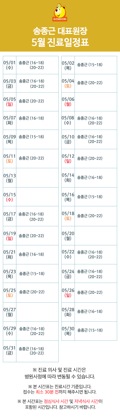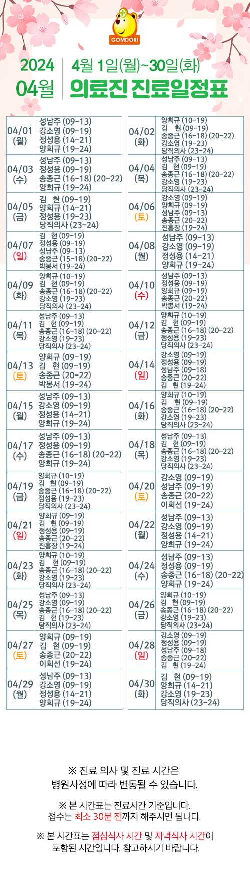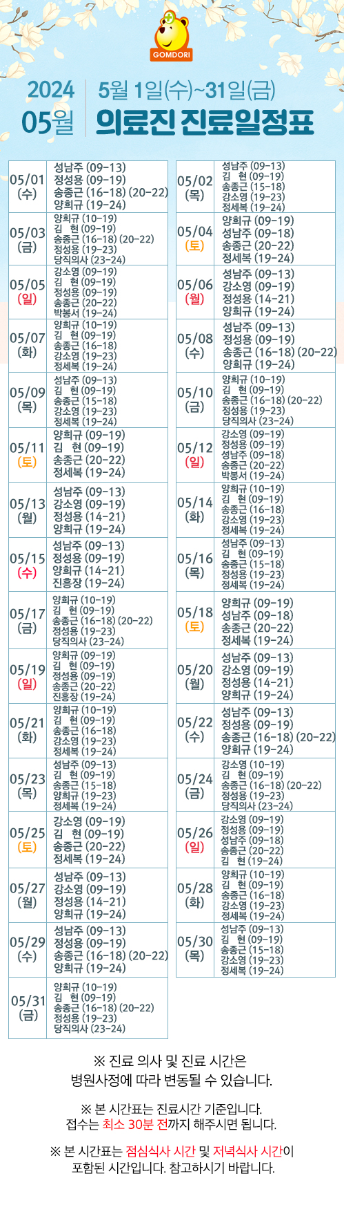 ※ 진료 의사 및 진료 시간은 병원사정에 따라 변동될 수 있습니다.