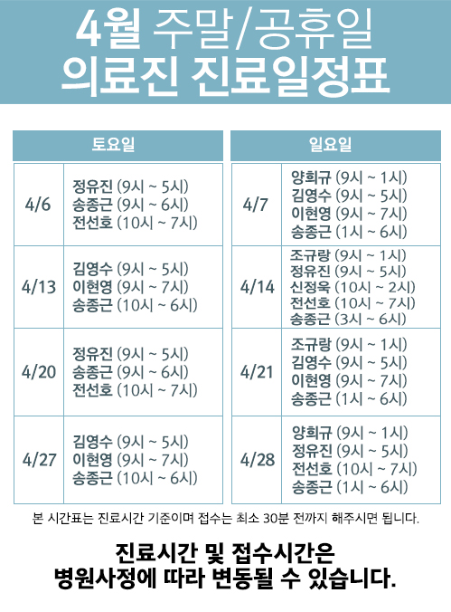 ※ 진료 의사 및 진료 시간은 병원사정에 따라 변동될 수 있습니다.