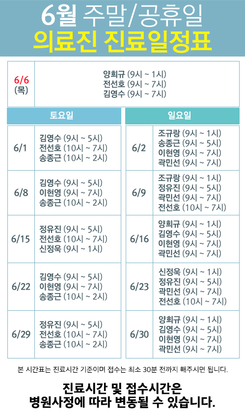 6월 주말/공휴일 의료진 진료일정표