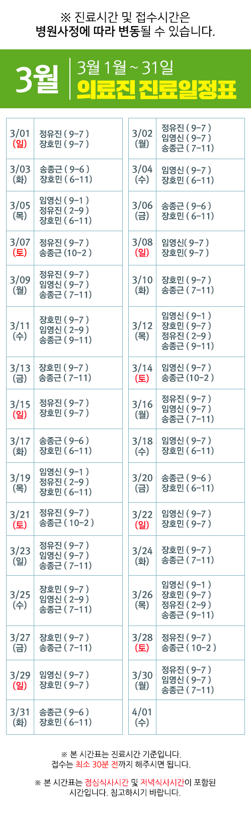 ※ 진료 의사 및 진료 시간은 병원사정에 따라 변동될 수 있습니다.