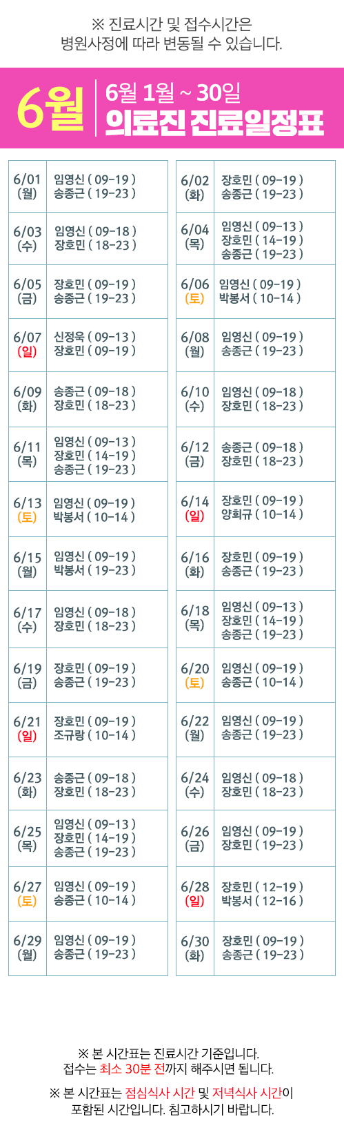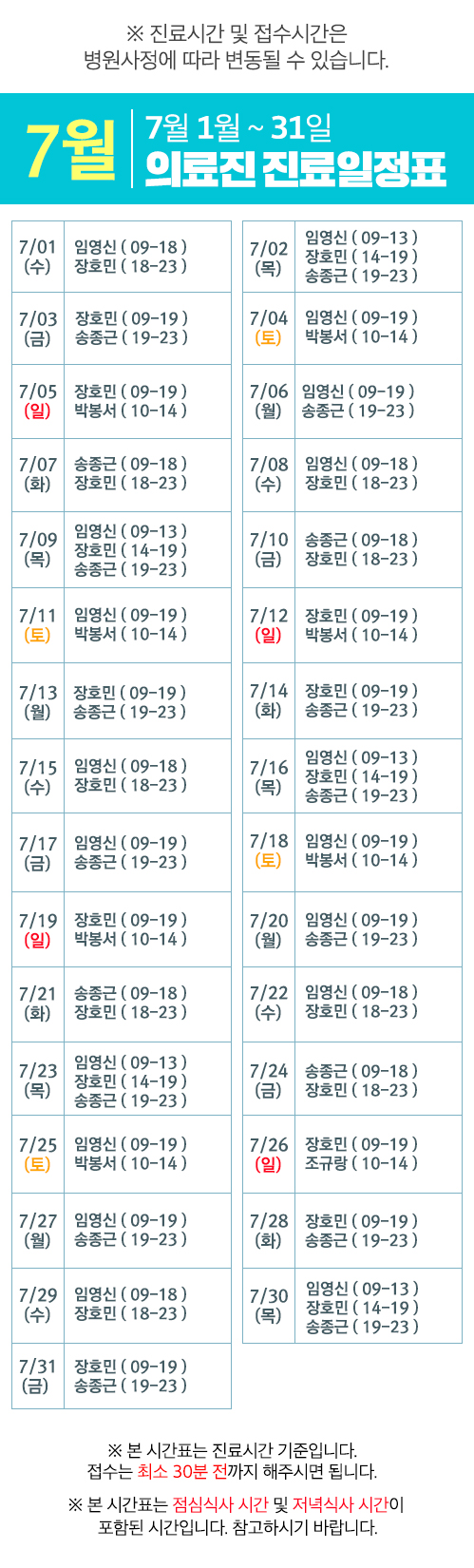 ※ 진료 의사 및 진료 시간은 병원사정에 따라 변동될 수 있습니다.