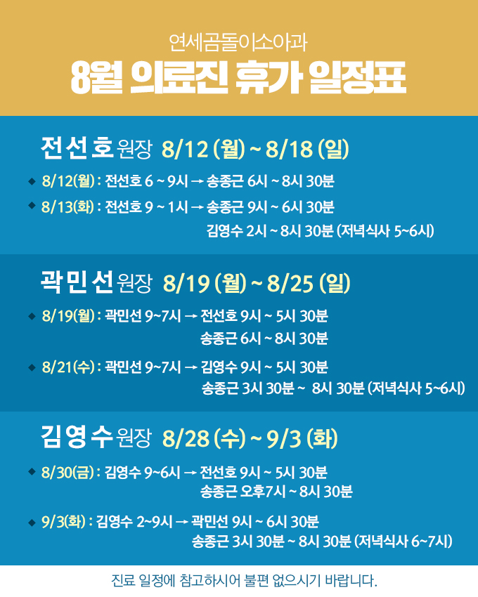 8월 주말/공휴일 의료진 진료일정표 & 휴가 일정표