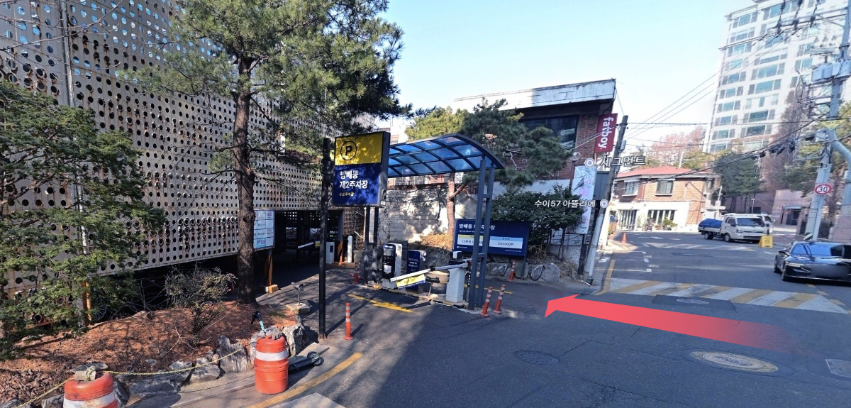 ▶ 이수교차로에서 방배삼호아파트앞 삼거리 → 함지박사거리 전 유턴 → 골목진입 → 주차장